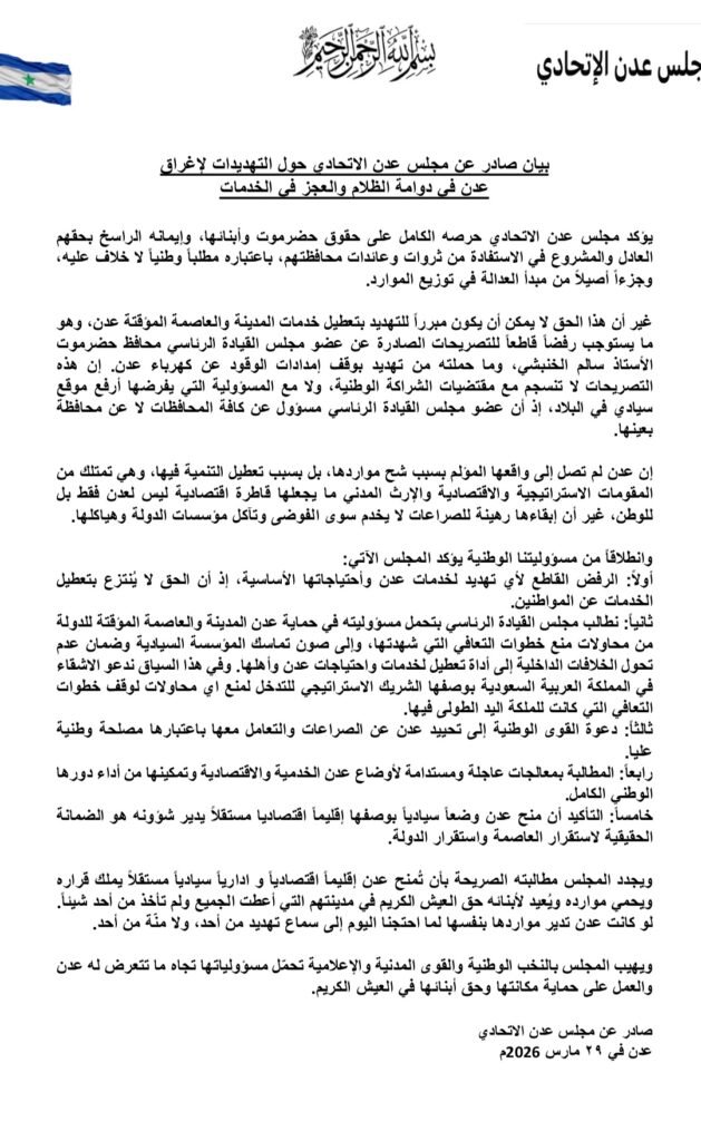 وفي إطار ما وصفه بمسؤوليته الوطنية، طرح المجلس جملة من المطالب أبرزها رفض أي مساس بالخدمات الأساسية للمدينة، ودعوة مجلس القيادة الرئاسي لتحمل مسؤولياته في حماية عدن وضمان استمرار خدماتها، إلى جانب منع تحويل الخلافات السياسية إلى أدوات ضغط تمس حياة المواطنين.