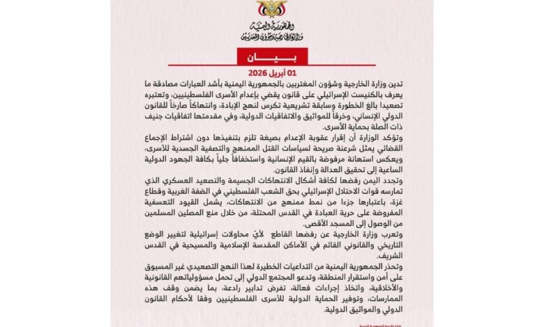 أدانت وزارة الخارجية وشؤون المغتربين في اليمن، اليوم الثلاثاء، مصادقة الكنيست الإسرائيلي الصهيوني على مشروع قانون يقضي بإعدام الأسرى الفلسطينيين، واصفة الخطوة بأنها “تصعيد خطير وانتهاك صارخ للقانون الدولي الإنساني”.