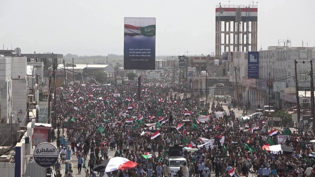 واحتشدت الجماهير في مشهد عكس حجم الغضب الشعبي والاستنكار الواسع للتدخلات الإيرانية في الشؤون العربية، حيث رفع المشاركون أعلام المملكة العربية السعودية ودول الخليج العربي والمملكة الأردنية، إلى جانب صور خادم الحرمين الشريفين الملك سلمان بن عبدالعزيز، وصاحب السمو الملكي الأمير محمد بن سلمان ولي العهد، وفخامة رئيس مجلس القيادة الرئاسي الدكتور رشاد محمد العليمي.