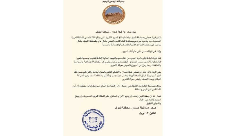 أصدرت قبيلة همدان بمحافظة الجوف، الاثنين، بياناً أكدت فيه متابعتها باهتمام بالغ للجهود الكبيرة التي تبذلها المملكة العربية السعودية في دعم أبناء الشعب اليمني، مشيدةً بما تقدمه من إسناد لمحافظة الجوف على مختلف المستويات الأمنية والعسكرية والإنسانية والتنموية.