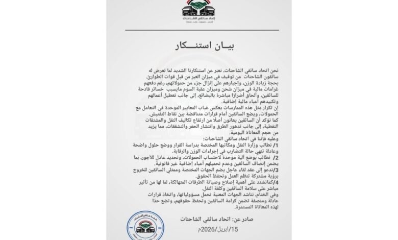 وطالب البيان وزارة النقل والجهات المختصة بدراسة هذه الإشكاليات ووضع حلول واضحة وعادلة لمعالجة التضارب في إجراءات الوزن والرقابة، داعياً إلى تطبيق آلية موحدة لاحتساب الحمولات، وتحديد عادل للأجور بما يضمن إنصاف السائقين وعدم تحميلهم أعباء إضافية غير قانونية.