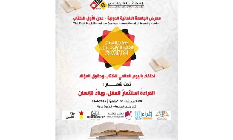 في أجواء ثقافية لافتة وحضور مميز، شهدت الجامعة الألمانية الدولية – عدن، اليوم الخميس 23 إبريل 2026م، نجاحًا باهرًا لانعقاد المعرض الأول للكتاب، الذي أُقيم احتفاءً باليوم العالمي للكتاب وحقوق المؤلف، وبرعاية رئيس الجامعة الأستاذ الدكتور عبدالفتاح عباس السعيدي، وبإشراف نائب رئيس الجامعة الأستاذ الدكتور أنيس عبدالله شعفل.