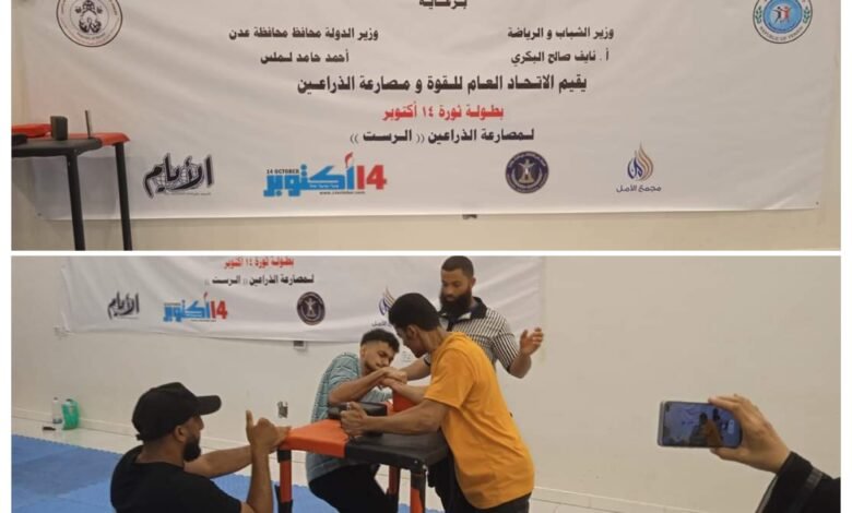 برعاية وزير الشباب والرياضة أ. نايف البكري، ووزير الدولة محافظ محافظة عدن أحمد حامد لملس، أقام الاتحاد العام للقوة ومصارعة الذراعين صباح امس في قاعة مجمع الأمل بالممدارة الجديدة بطولة ثورة 14 أكتوبر لمصارعة الذراعين ” الرست ” بمشاركة 200 لاعب من عدد من المحافظات المحررة عدن، ولحج، وتعز، وحضرموت الساحل والوادي، والضالع، تم تصنيفهم وتقسيمهم بحسب الأوزان المتعارف عليها في إطار لوائح هذه اللعبة.
