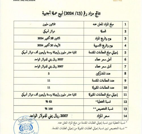 أعلن البنك المركزي اليمني، اليوم الإثنين، بيع 18 مليون و446 ألف دولار أمريكي، من أصل 30 مليون دولار عُرضت للبيع في مزاد علني.