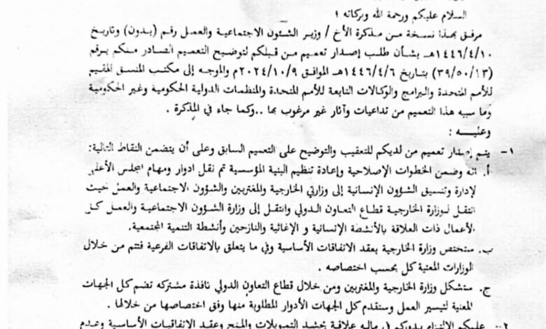 وفقاً لمصادر إعلامية، أصدر عامر تعميماً في 9 سبتمبر إلى مكتب المنسق المقيم للأمم المتحدة، يطالب بنقل مهام قطاع التعاون الدولي إلى وزارة الخارجية، مما أثار استياء ماتسمئ وزارة الشؤون الاجتماعية التي تعتمد على هذا القطاع في الحصول على الدعم عبر الأنشطة الإغاثية.