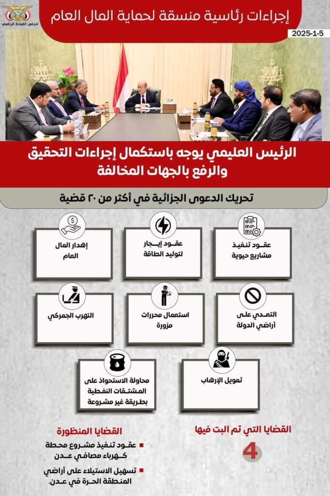 وتلقى مجلس القيادة الرئاسي تقارير من سلطات انفاذ القانون، والاجهزة الرقابية والمحاسبية بشأن القضايا المنظورة امامها، كما وجه فخامة الرئيس الدكتور رشاد محمد العليمي رئيس مجلس القيادة بناء على توصيات المجلس بسرعة استكمال اجراءات التحقيق في كافة القضايا، والرفع بالجهات المتخلفة عن التجاوب مع الاليات الرقابية.