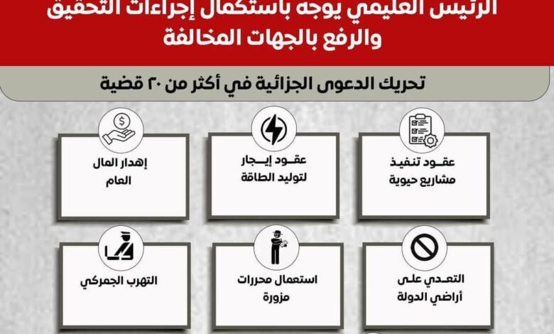 في وقت لاحق وجه فخامة الرئيس الدكتور رشاد محمد العليمي، رئيس مجلس القيادة الرئاسي، بتكليف فريق متخصص من الجهاز المركزي للرقابة والمحاسبة لتقييم اداء الهيئة العامة لاراضي وعقارات الدولة للفترات الماضية، ومدى مطابقة اعمالها لقانون اراضي وعقارات الدولة ولائحته التنفيذية.