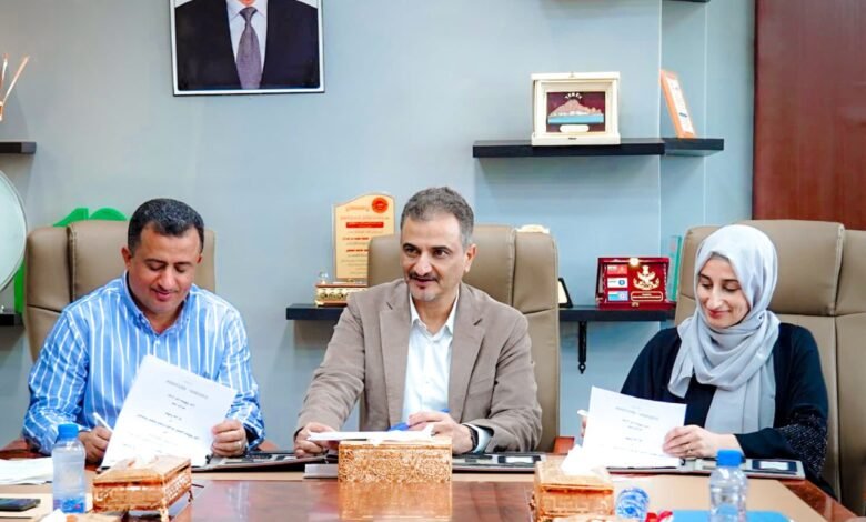 حضر التوقيع، انتصار مرشد مديرة مكتب التخطيط والتعاون الدولي بالعاصمة الموقتة عدن ، ومديرة مكتب الإعلام، هدى الكازمي، ومستشار المحافظ لشؤون المنظمات، رضا جميل حاجب،